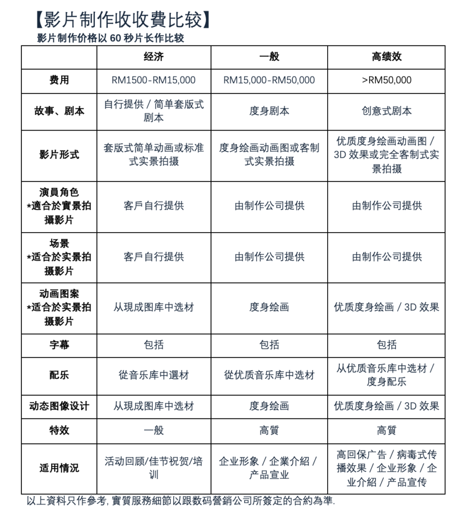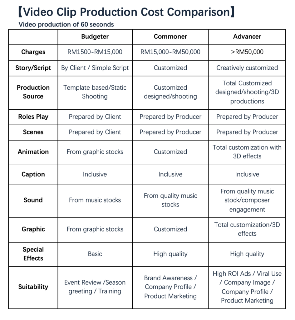 Companies introduce video clips, promotional videos, online commercials, motion pictures, etc. Due to the content creativity varies, technical cost involved varied too. And the price difference can be huge. The most costly part of video clip production is human resources. Especially the producer and excellent dynamic image designers are costly, and the more manpower required for shooting in reality, the more costly will be.